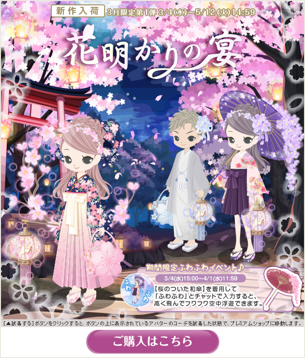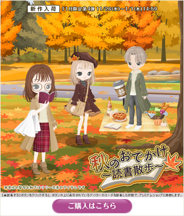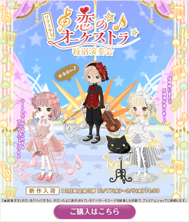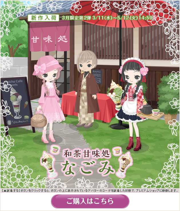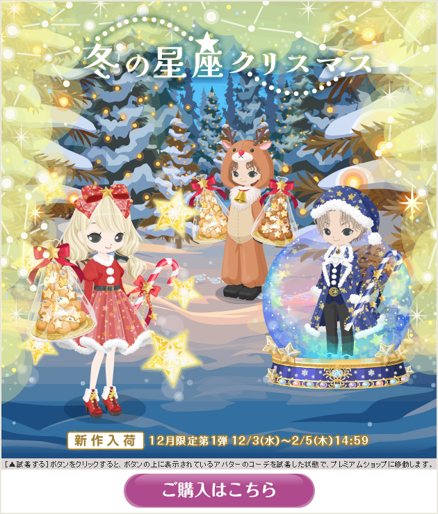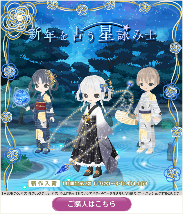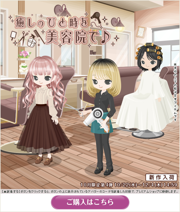 ※画像内のコーディネートには、無料ショップで取り扱っているアイテムや、販売期間外のアイテムが含まれていることがありますので、「このコーデを試着」ボタンをクリックしても、完全に画像と同じコーディネートにはならないことがあります。